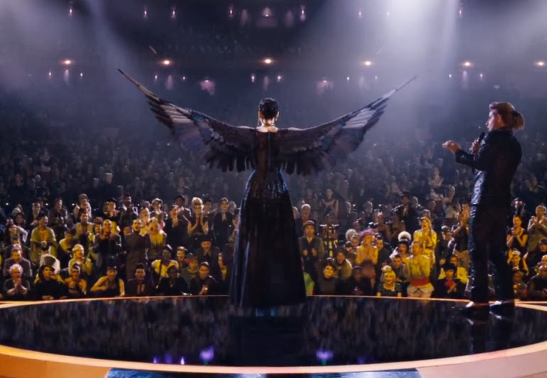 Second, the media-dipshit-woman (Effie?) losing her faith in the games over the course of the film, until she tearfully says sorry to Katniss and Peta.