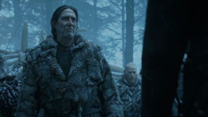 Mance, who as you may recall last season saved Jon from being murdered for being a member of the Night's Watch, is a bit miffed to find that his little protege is back to being a "crow". Mance was really rooting for you, Jon! How dare you! But Mance, being a shockingly nice guy, agrees to parlay. They meet in his tent-hut-thing, where Jon reveals that yes, he was lying the entire time he was cozying up to the Wildlings. Also they talk about how Ygritte is dead, and it is sad.