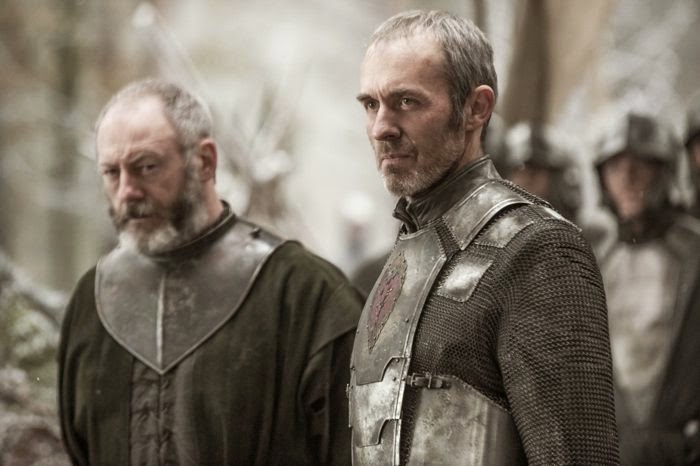 The leaders of this mystery army come forward and...it's Stannis Baratheon and Davos Seaworth. I guess they got that army they were trying to buy. And their attack strategy seems to be conquering the North. Not a bad strategy. Still, Stannis is as charisma-less and dour as ever (I kind of wish they'd cast Christopher Eccleston in the part, but that wouldn't work since Eccleston is so stinking charismatic in everything). He demands that Mance bow to him, because he is the "One True King".