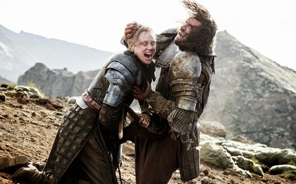 Nobody wins, in the end. The Hound is mortally wounded, and Brienne is left wondering where Arya has gone. She and Pod go after the girl, who honestly just hid in the rock and comes down to watch the Hound die. He begs her to kill him. She doesn't. She just watches, then takes his money, then goes away. Because Arya is a terrifying murder child. Kudos to Maisie Williams, though. That scene was fantastic.
