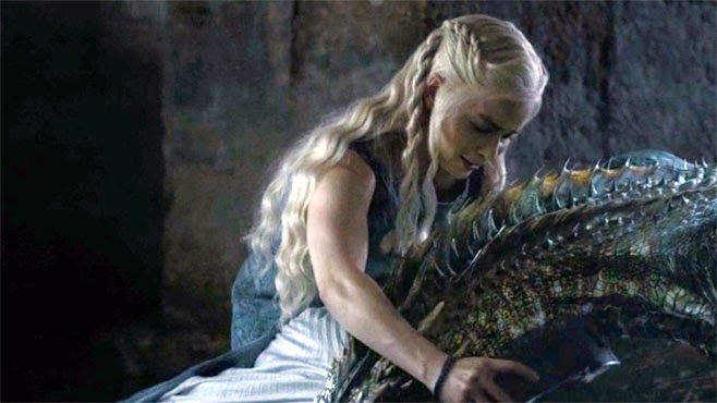 Then the next petitioner comes in, and his case is a little more complex. He holds a bundle in his hands: it's his daughter. Burned to death by dragonfire. Ugh, my heart is breaking, and so is Dany's. She consults with Missandei and Grey Worm after. Drogon, the dragon that did it, is missing and has not been seen in days. But she can do something about the other two. Dany calls her other two dragons down into the catacombs. She has meat for them there. And also massive freaking chains.