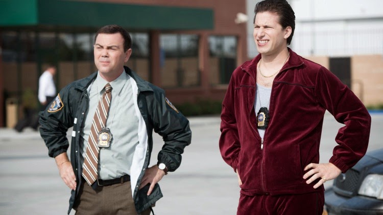 The episode picks up six months after the last episode (which handily aired about six months ago). At the end of that episode, our hero, Jake Peralta (Andy Samberg), got himself fired from the NYPD so that he could go on an undercover sting infiltrating the Ianucci mob family. Coming back in, we now get to see the very end of Peralta's operation. He's very popular with the mobsters now, gladhanding and giving a toast at some mafioso's wedding. The old men of the family even give him some traditional on-the-mouth kisses to signify that he's "one of us now". Which means it's time for Peralta to give his codeword and for NYPD to bust the wedding.