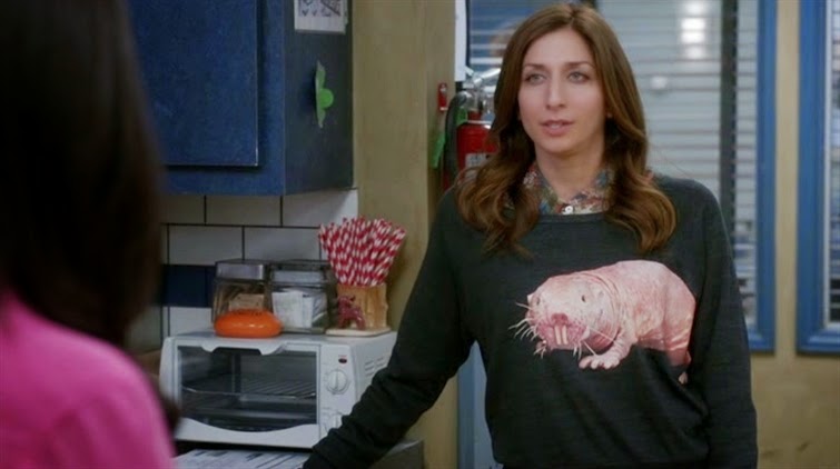 It's almost like nothing happened while he was gone too, aside from Boyle (Joe Lo Truglio) and Santiago (Melissa Fumero) accidentally wearing the same outfit to work one day, Gina (Chelsea Peretti) single-handedly got headphones banned from the precinct, and Terry (Terry Crews) chipped a tooth and spent a week interrogating perps with an adorable lisp. In other words, business as ridiculous usual. And, for the viewers just joining the show now, a handy recap of who these characters are and how they relate to each other. I mean, that's some good writing. It's quick, hilarious, and easily communicates the major character dynamics of the show. Right on!
