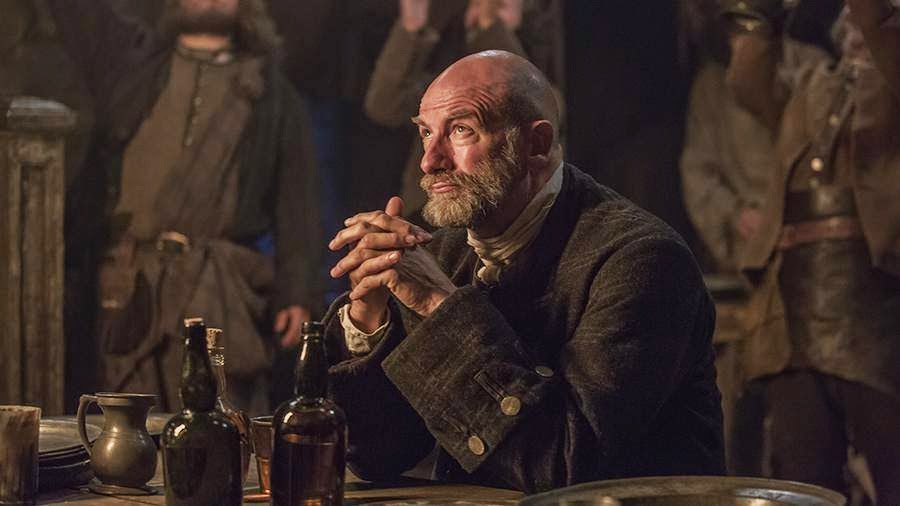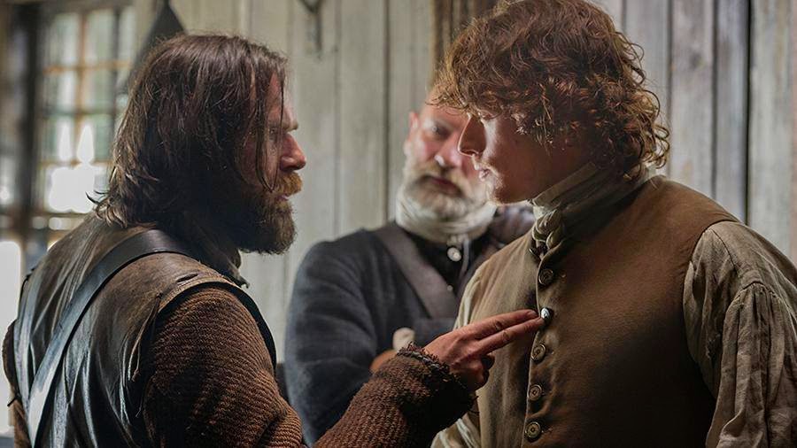 I also like the symbolism of Claire, wrapped up in the Fraser plaid, being faced with intimidation from Dougal, war chief to the MacKenzies. It makes clear that even though she's now legally a Scot, Claire is still an outsider. She does not belong.