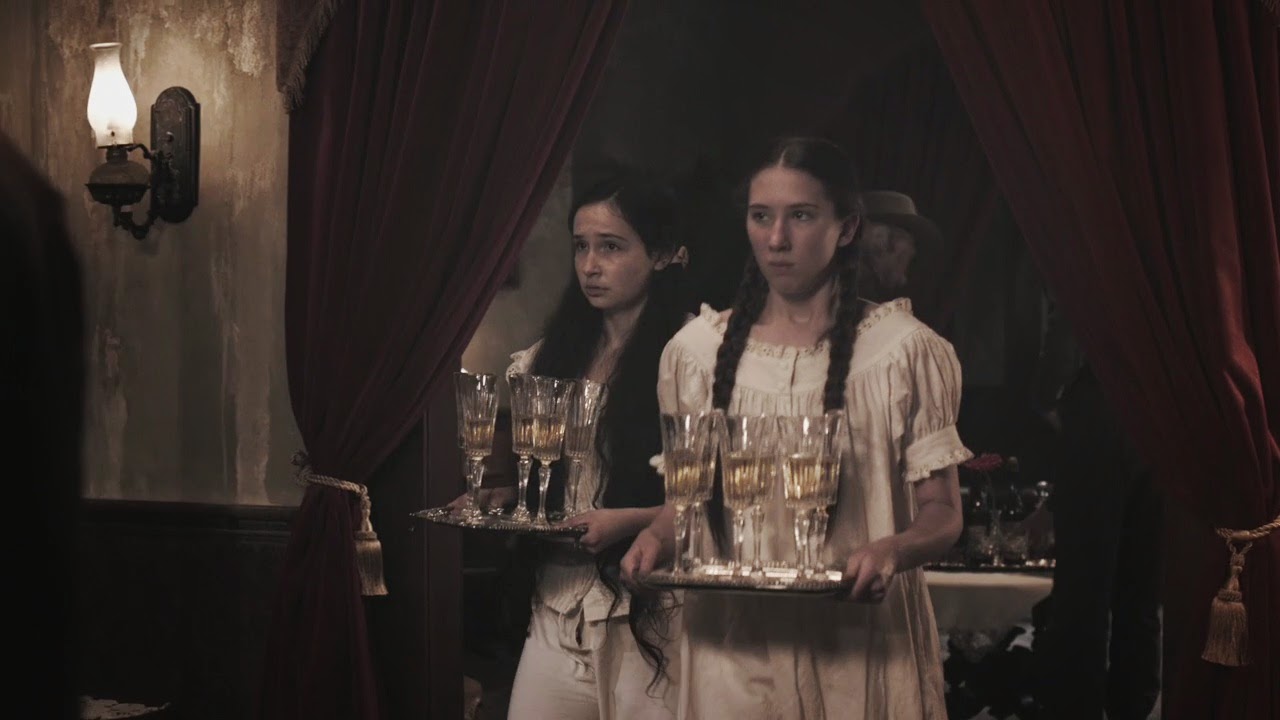 Cut to night time at the whorehouse. Men arrive on horseback and come inside to hear Slotter’s speech for the investors. Basically, he’s helping build the railroad, but he’s also running a coal mine, and he wants these men to invest in the coal mine. And since the men won’t invest for no reason, Isabelle brings out the whores to get their interest up. Including Robin and Kelly wearing nighties and serving drinks.