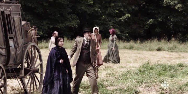 Well, Thomas is widowed and Rebecca is his new wife. From their faces during that pronouncement, it’s clear that neither of them is thrilled about this. Thomas is putting a good face on it, but Rebecca really isn’t. Unclear if that’s because she’s upset to be married to him or because she misses his wife too. Hard to say at this point. But something is up.