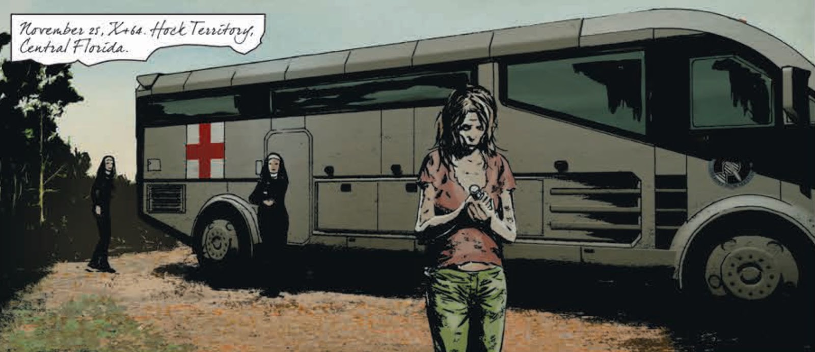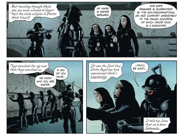 One major plotline in the second arc of the story follows a family of "waste" trying to get to Denver so that their children just might have a chance to prove themselves in service to the Family. It's their one shot at staying alive, very literally, and even though they hate the Family for what it does to them, they need help. At the same time, a group of radicals plots to blow up a member of the Family in a political statement about how they are exploited and beaten down.