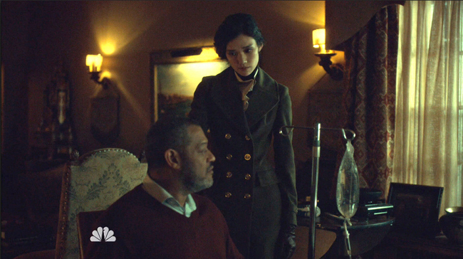 Hannibal, meanwhile, carries an unconscious Will away from Muskrat farm, as a hidden Chiyo snipes down their pursuers behind them from her perch amidst the trees. Somehow Hannibal manages to get Will all the way back to Will’s home in Wolf Trap***, and puts him to bed before he and Chiyo finally have a heart-to-heart that’s been a long time coming.