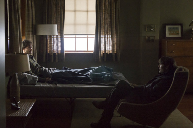 Possibly the best moment amidst this tension comes when Mason, Will, and Hannibal are seated at a dinner table and Mason instructs his nurse/caretaker/personal human-meat chef to moisturize Will’s face. When the man, Cordell, gets too close, Will leans over and bites a chunk out of Cordell’s cheek, spitting the blood-soaked lump of flesh onto his plate with a red-stained face and giving Hannibal a sidelong glance. Hannibal, for his part, looks like a proud mama bird whose baby has just left the nest.