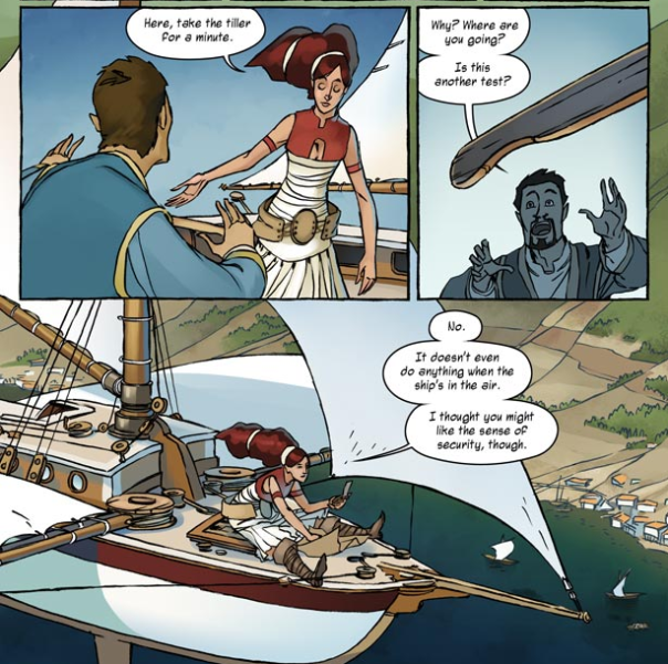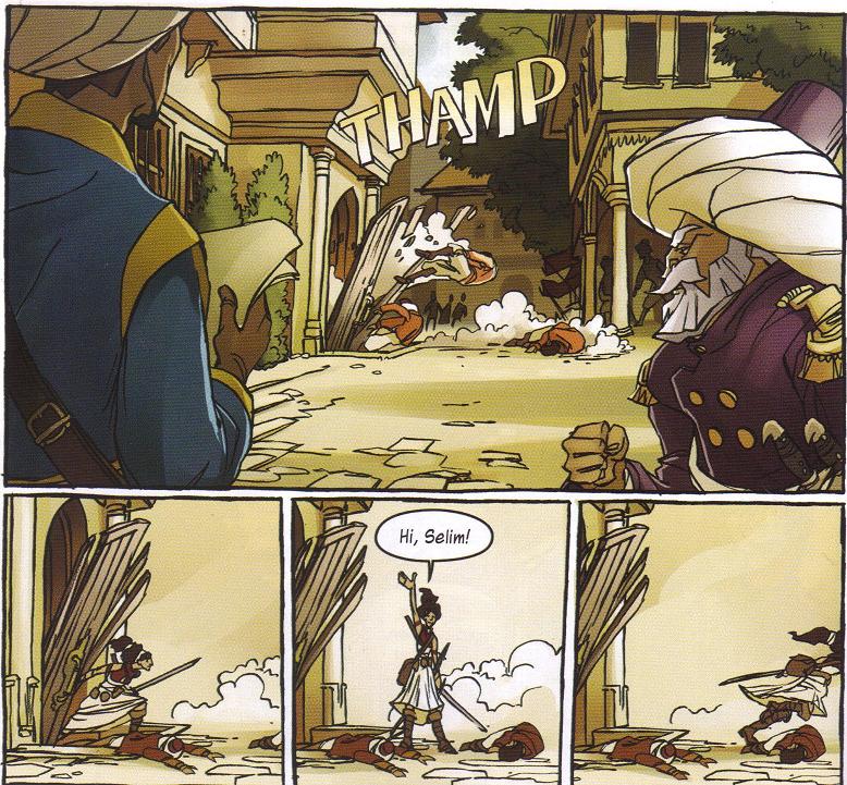 Selim, as a lieutenant of said Sultan, is the one tasked to go in and interrogate the prisoner. What he finds, over an interrogation that's really more tea and cookies than whips and flails, is that Delilah Dirk has the kind of backstory superheroes drool over. She's the daughter of an English ambassador and a Greek artist. She's lived all over the world, learned secret fighting techniques and special abilities wherever she went. She has a ship that can fly, can escape any jail cell, and goes about the world making her fortune as a "retrieval specialist" and general madcap adventurer.