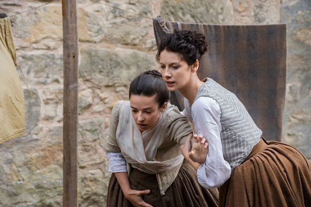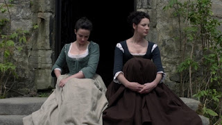 Back home, Jenny is surprised to wake up and find that she had a girl, not a boy, because she was sure it was a boy, but not upset over it. She's alive and well and so is the baby. In fact, just three days later Jenny is walking around just fine and even sitting on some cold stone steps with Claire. Ow. She and Claire have a bonding moment while they wait for the men to come back. Jenny is sure they will, but Claire is worried. Even the brief joy of Jenny giving her a pair of boar's tusk bangles can't distract her.