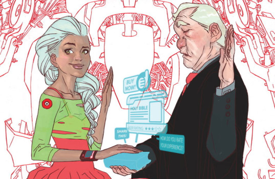 Hers is not the only story, however. Alongside the tale of "President Ross", we're also given a plotline about an artificially intelligent killer robot gone rogue. Instead of a story about bloodshed and "we shouldn't have played God!", though, it turns out the robot is really cool. She likes to be called Tina, hates the term artificial intelligence, and ends up living with a nice pastor and his wife in Florida.