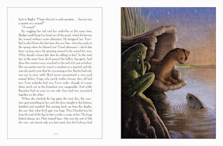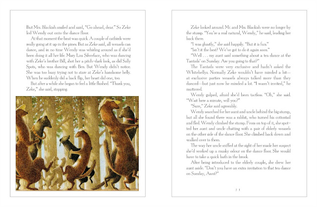Those fears being, of course, of heights, open spaces, and large birds. Bagley's father, who died when he was little, was carried off in front of him by a large owl. The owl also clawed out Bagley's eye, leaving him traumatized and with very poor depth perception. Anyway, his mission is to save the pond, and the way he does it is positively ingenious. Even better, when Bagley can't finish the job himself, the other weasels rally around him and help.