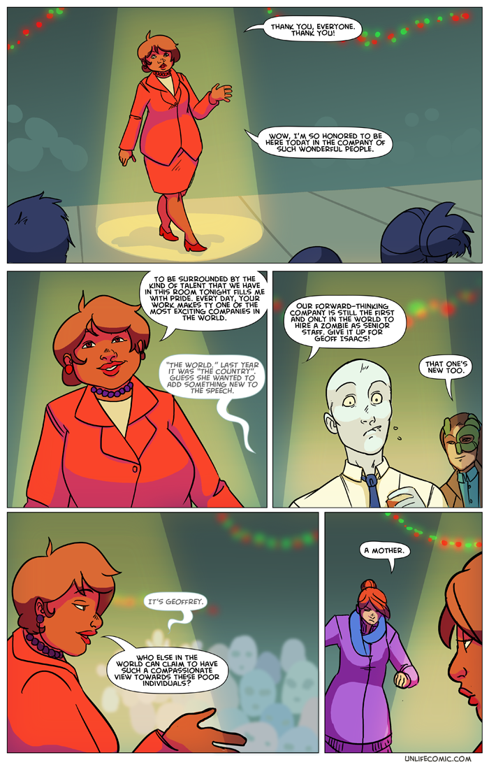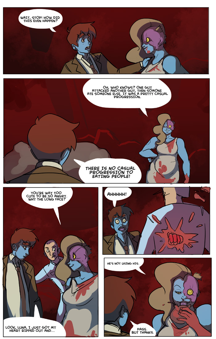 Then again, there's a possibility this is just me. I stare at pop culture for a living, so there's a strong possibility that I get sick of stuff well before you do. For what it's worth, the plot of Unlife really is pretty interesting - there's a solid conspiracy going on and some super shady stuff building up in recent chapters. Admittedly it's very white (there's only one explicitly non-white character and his race is referenced uncomfortably often) and there is an uncomfortable correlation between the only plus-size female character being the most lascivious, but the plot is cool. Really, your mileage is going to vary a lot on this one.