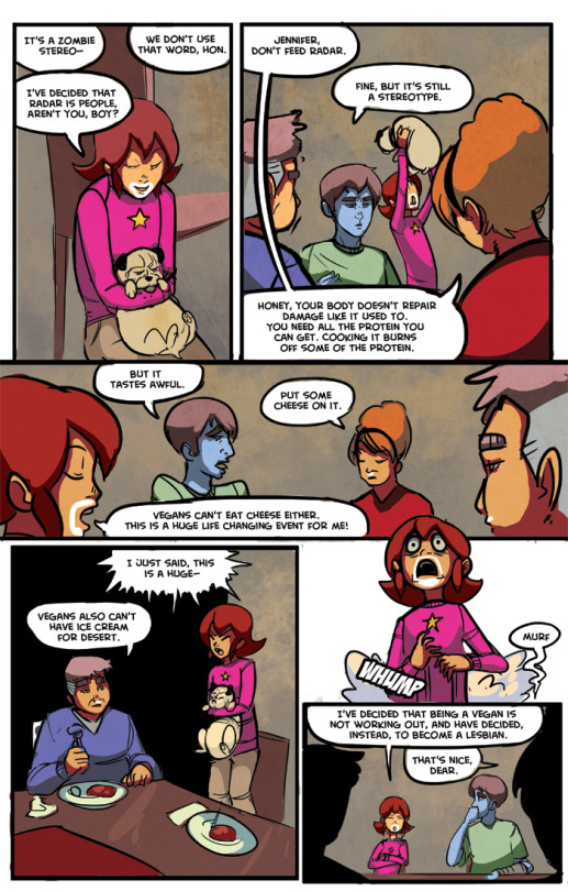 When the comic starts, James is living at home with his incredibly accepting and loving parents, Arnie and Doris, and his little sister, Jenners. Jenners is actually one of the most interesting characters, if only because she absolutely refuses to accept her brother's zombification complacently, and her progression through the storyline is a real highlight. Anyway.